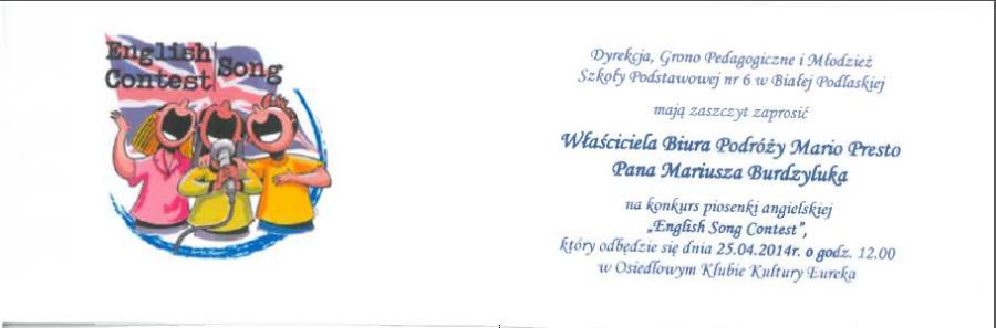 Finał konkursu „English Song Contest”, nad którym patronat objął Prezydent Miasta Biała Podlaska, odbył się w Osiedlowym Klubie Kultury Eureka 25.04.2014r. Konkurs organizowała Szkoła Podstawowa nr 6 we współpracy z Bialskim Centrum Kultury.